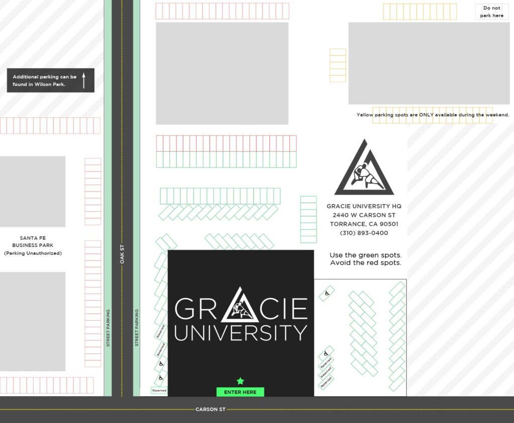 Gracie University Headquarters is located at 2440 W. Carson Street in Torrance. We offer ample parking in the west, east, and north lots, all conveniently located adjacent to our building. Additional street parking is available on Oak Street.